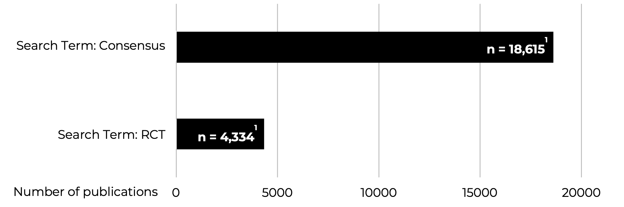 A simple PubMed search (using MeSH terms) demonstrated the number of published RCT studies versus opinion/consensus studies in 2021.1. It showed that more opinion-based evidence, such as delphi consensus-derived evidence, was published in 2021 compared to RCTs. Driven in part by the need to address answers to clinical questions to treatment and management of an emerging condition – Covid-19 but spanning a range of conditions and settings.